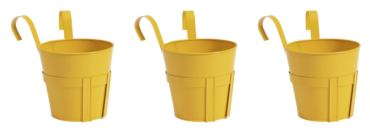 Here's a dashing trio of bright balcony metal planters. Fill them with trailing plants or seasonal blooms to transform your outdoor space or patio. In a sunny yellow finish, they're easy to hang up with the curved hooks. Plus, planting is a breeze since you can take each pot out completely. Time to show off those green fingers.