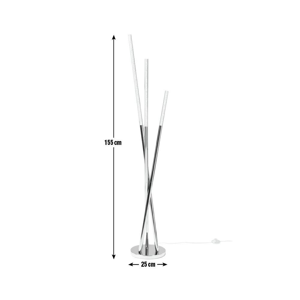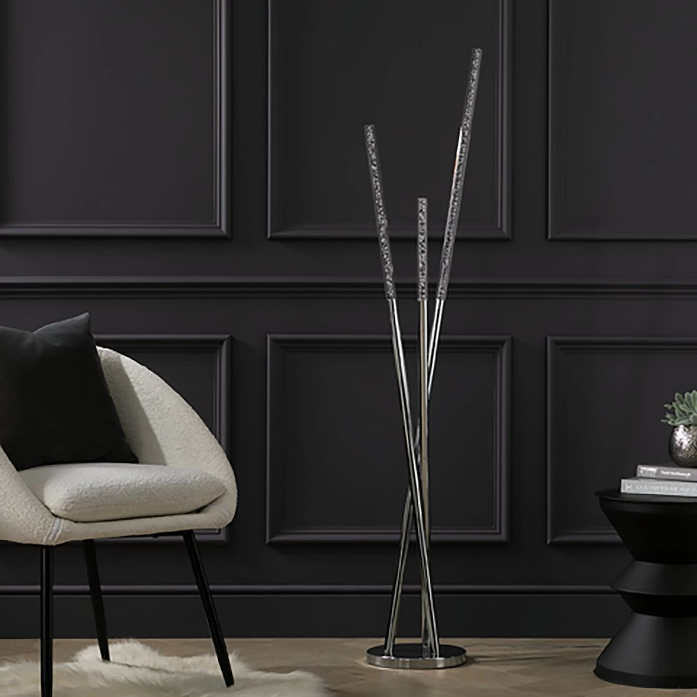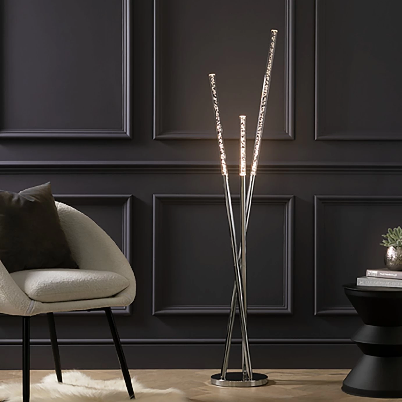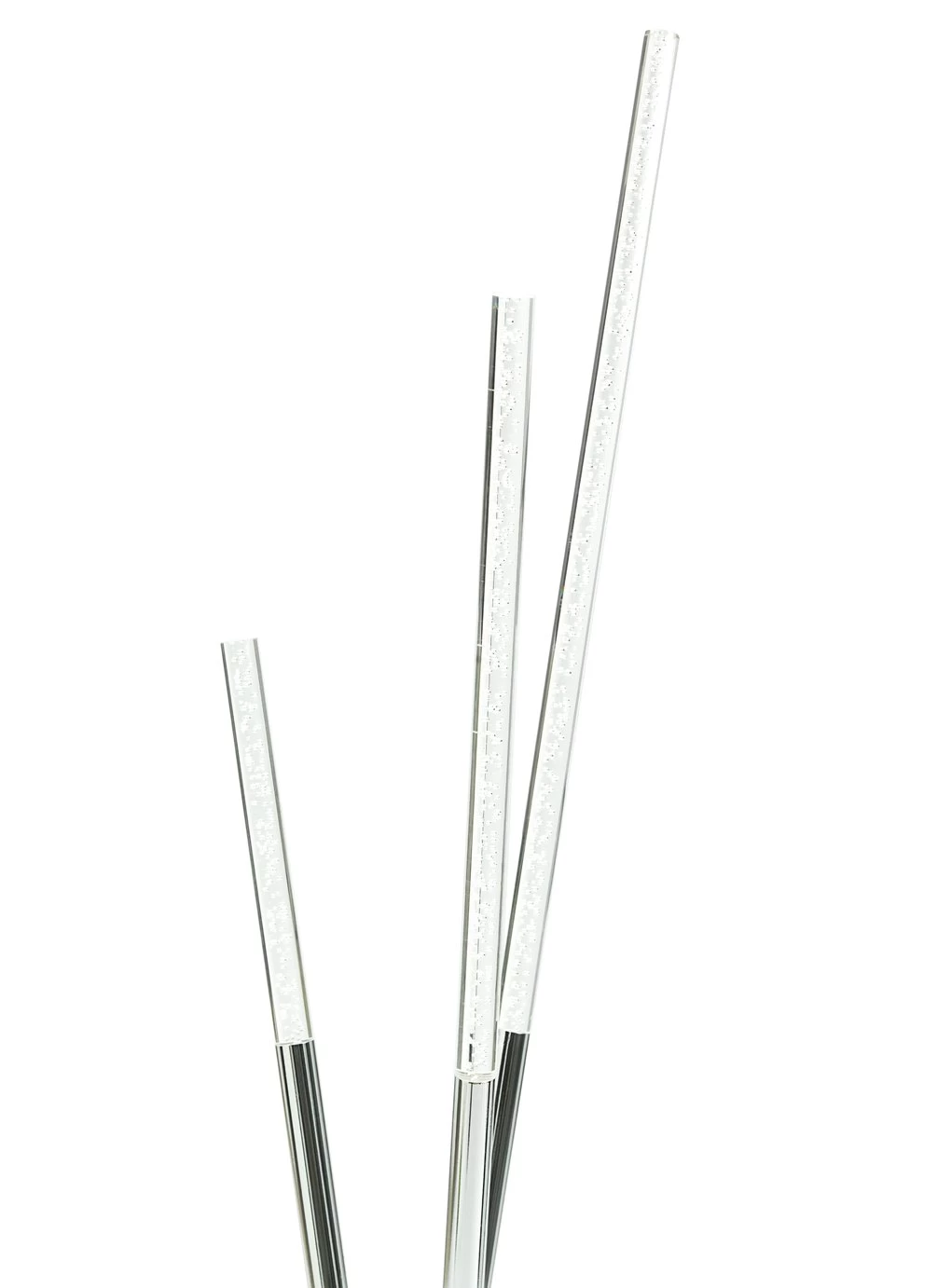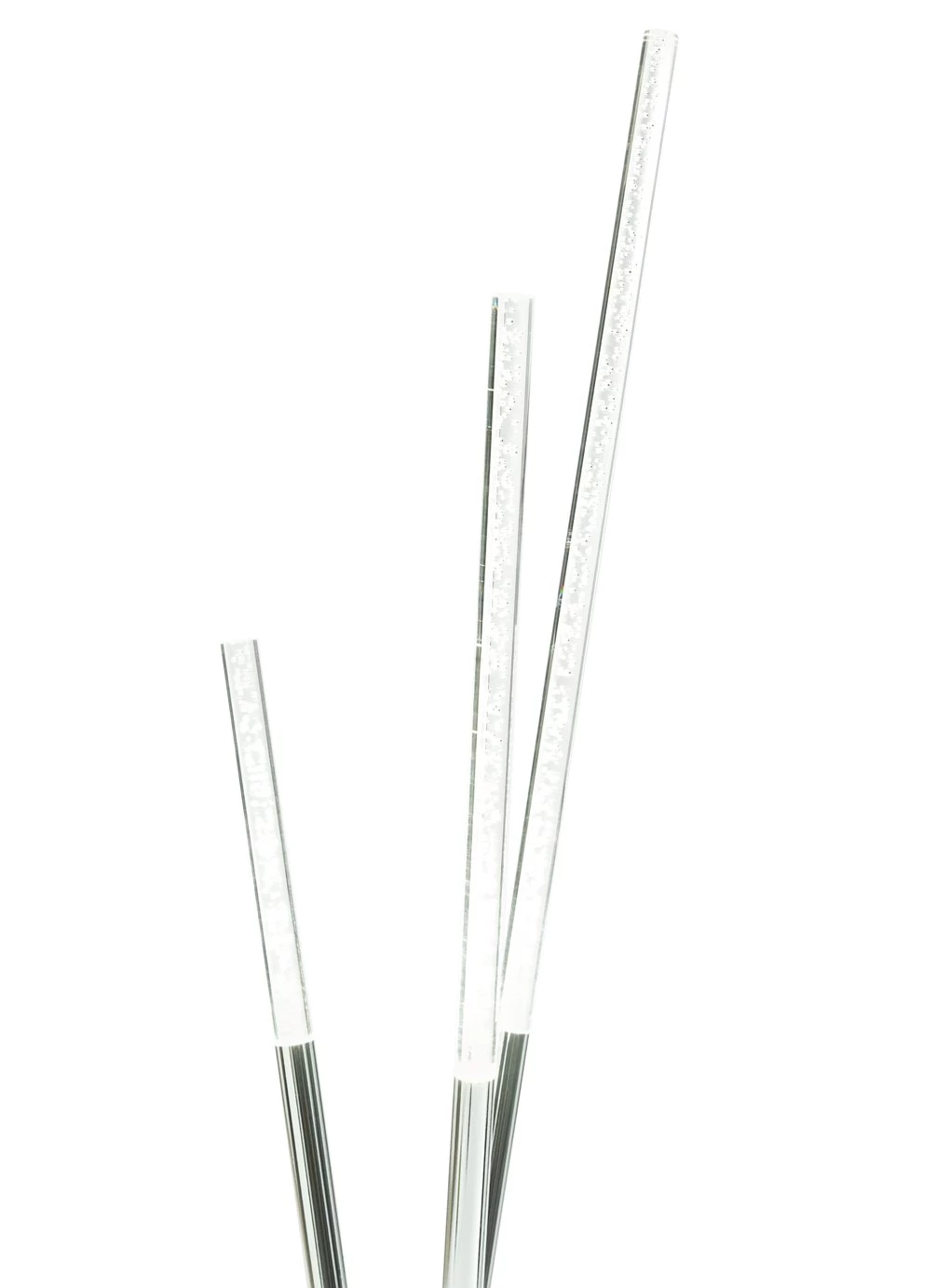 Glow up your corners. This elegant trio of bubble wands lights set on a chrome base sit sleek and chic during day. At night they come alive. Tap the floor switch to turn them on. Ta Dah! Light bounces off the bubbles in the wands – throwing a warm, bewitching glow into dark corners of the room. Slim and 155cm tall, this Luxe style floor lamp is perfect for smaller modern spaces.