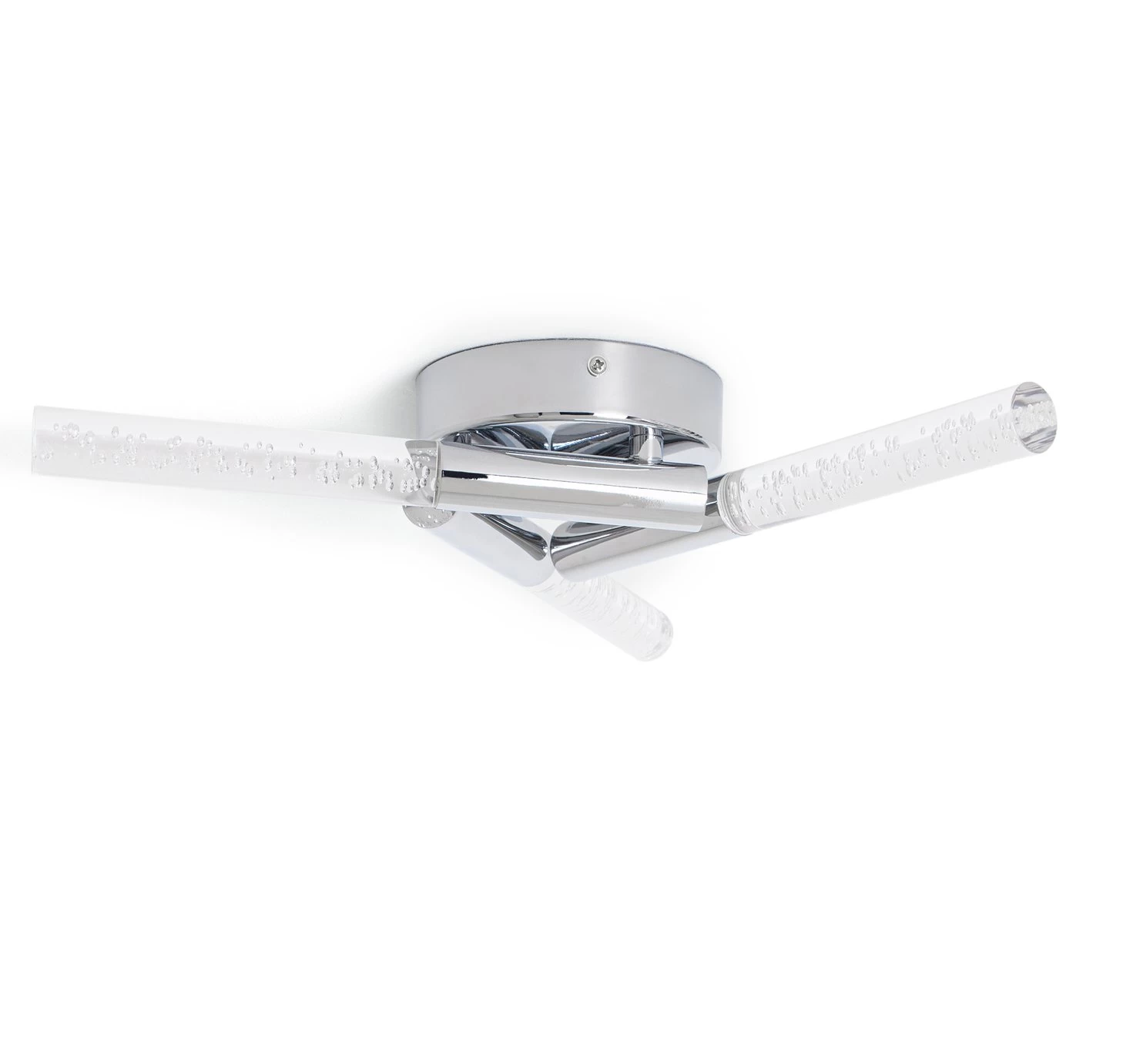Glam it up. This elegant glass and chrome light sits flush with the ceiling. Radiating chic sophistication during the day, flick the switch at night and bask in the glow of a real statement piece. Soft light bounces off the bubbles in the trio of wands. Gives a friendly, cosy, intimate vibe to modern decor.