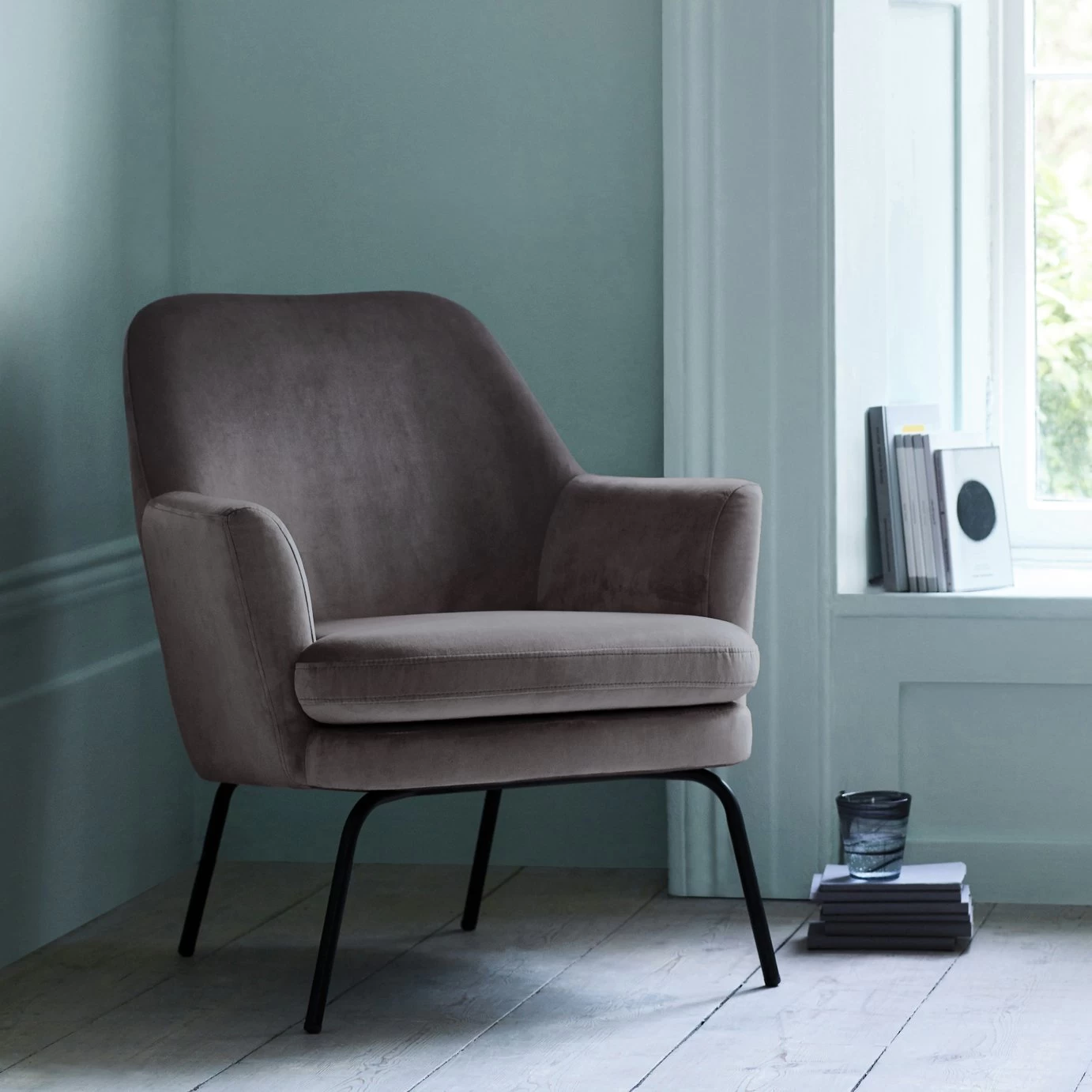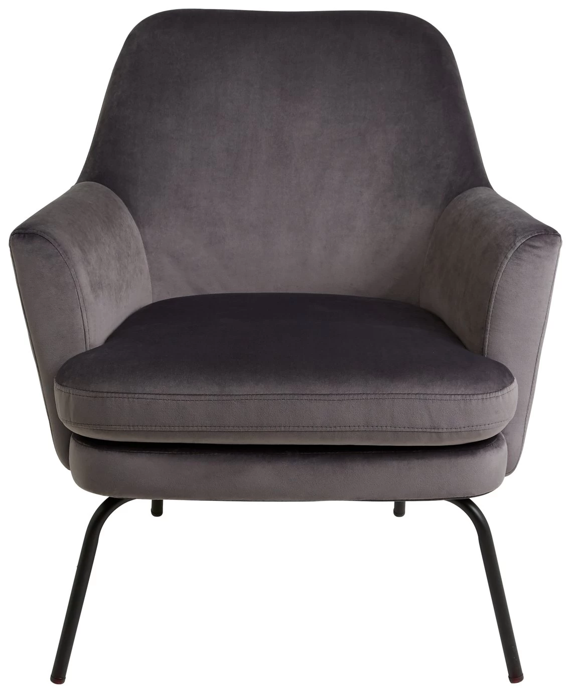 Original designs at suprisingly affordable prices. Designed by interiors brand Habitat, the Celine grey velvet armchair is a contemporary design that's perfect for small spaces. With a high reclined back, gentle round edges and foam-filled seat cushion padding, this armchair is as comfortable as it looks and is finished with black metal legs. Upholstered in durable polyester, this chair is part of the Celine collection and available in other colours.