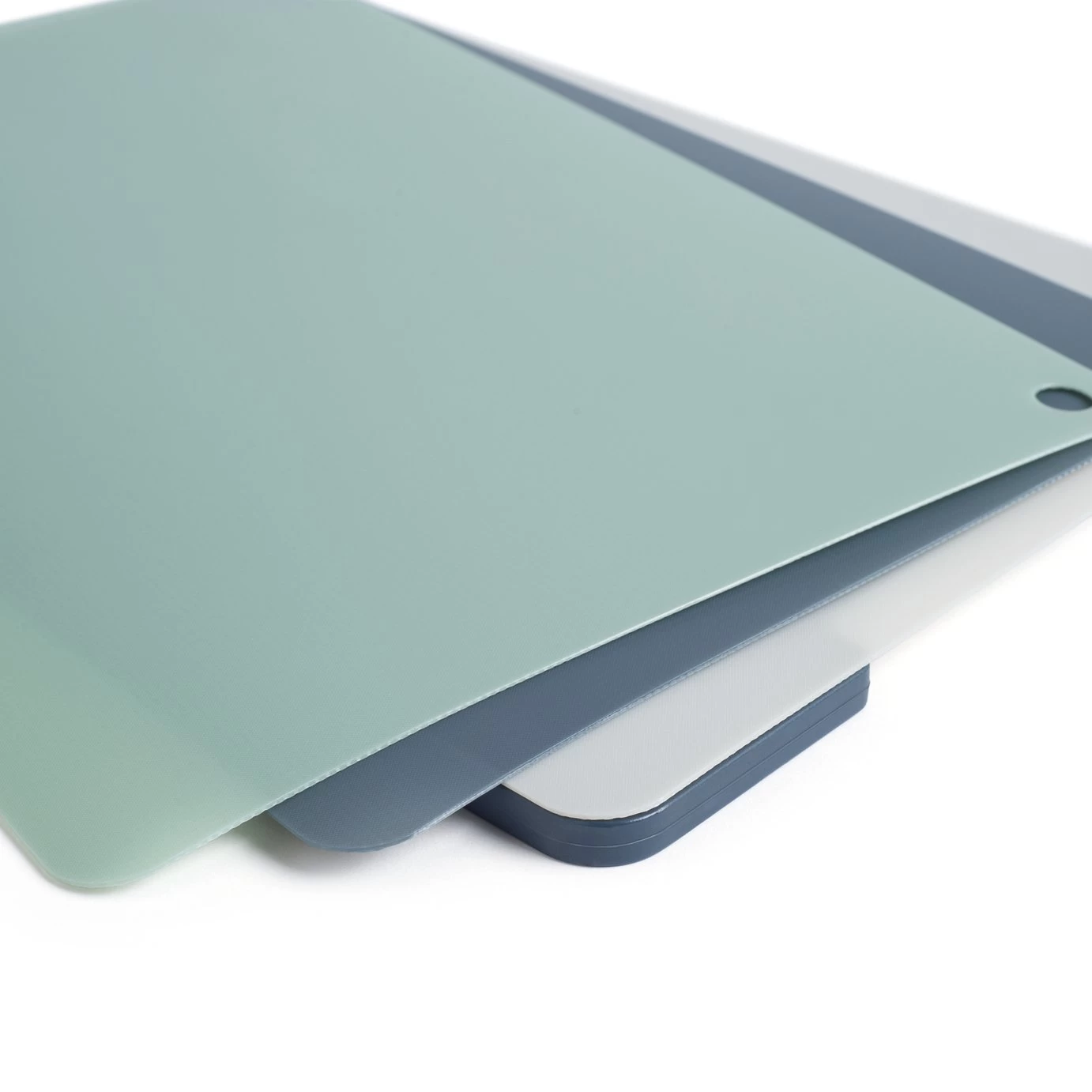Chop, chop! Here's a clever foursome to make your kitchen a happier place. One sturdy 0.90cm thick chopping board and three flexible 0.10cm thick boards. Finished chopping? Bend the flexible boards to tip food safely into the pan or the bin. Made of multi coloured, polypropylene. Use one each for veg, meat, fish and dairy to prevent cross contamination. Stain and odour resistant so they'll stay clean and pristine. Wipe down or stack in the dishwasher then nest them together to keep your kitchen tidy. That's neat!