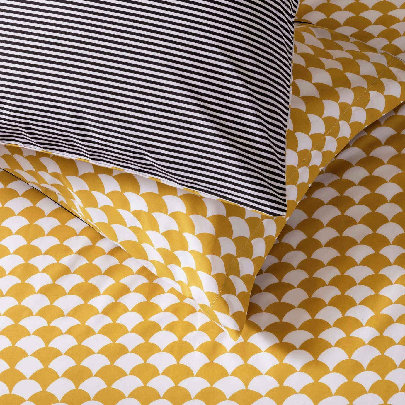 Designer's delight. Our Scallop bedlinens feature a mustard scallop graphic on one side and a grey pinstripe on the other. 100% cotton and a 180-thread count make them cosy to sink down into at the end of the day. A true design classic, Scallop fits with any decor style from Scandi to modern to country house. And this great value double set comes with 2 pillowcases and a duvet cover.