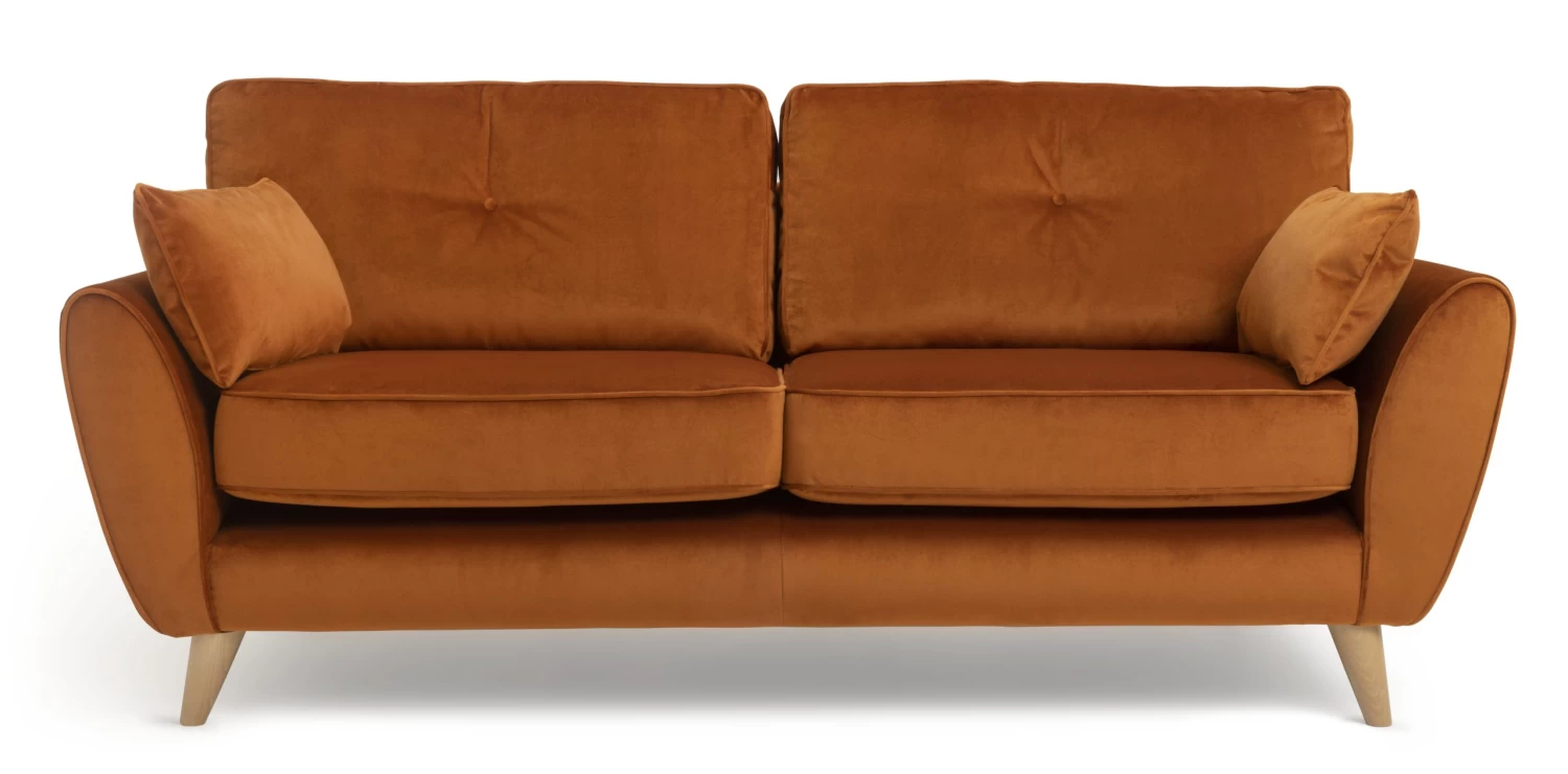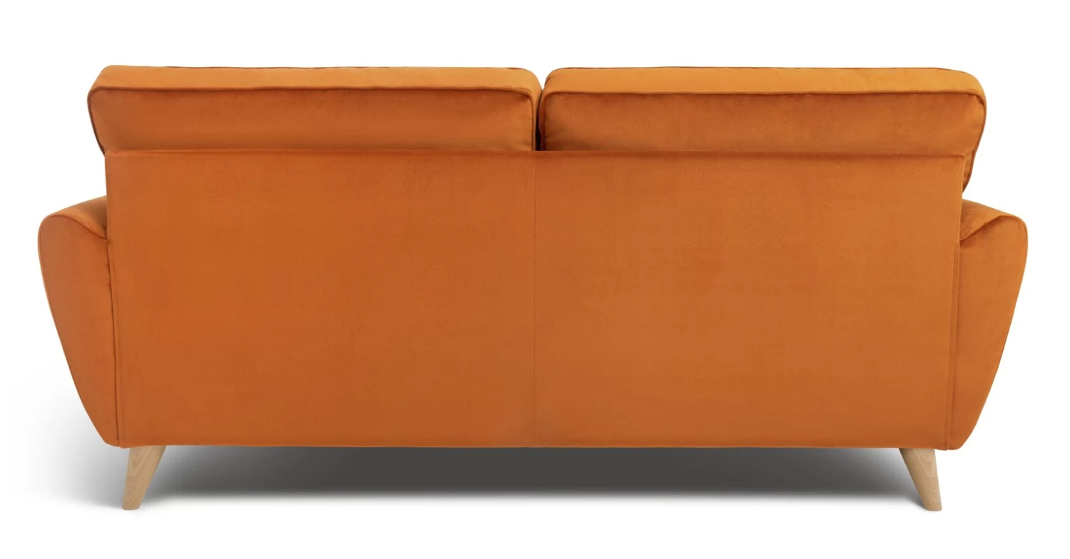 Get a chic retro look with our contemporary 3-seater Isla sofa. Mid-century modern features like – clean curves, a button back cushion and splayed beech wood legs – are designed to transform your living room into a luxe look lounge. Upholstered in 100% orange velvet, this piece doesn't scrimp on style or quality. Removable back and seat cushions make it easy to plump up.