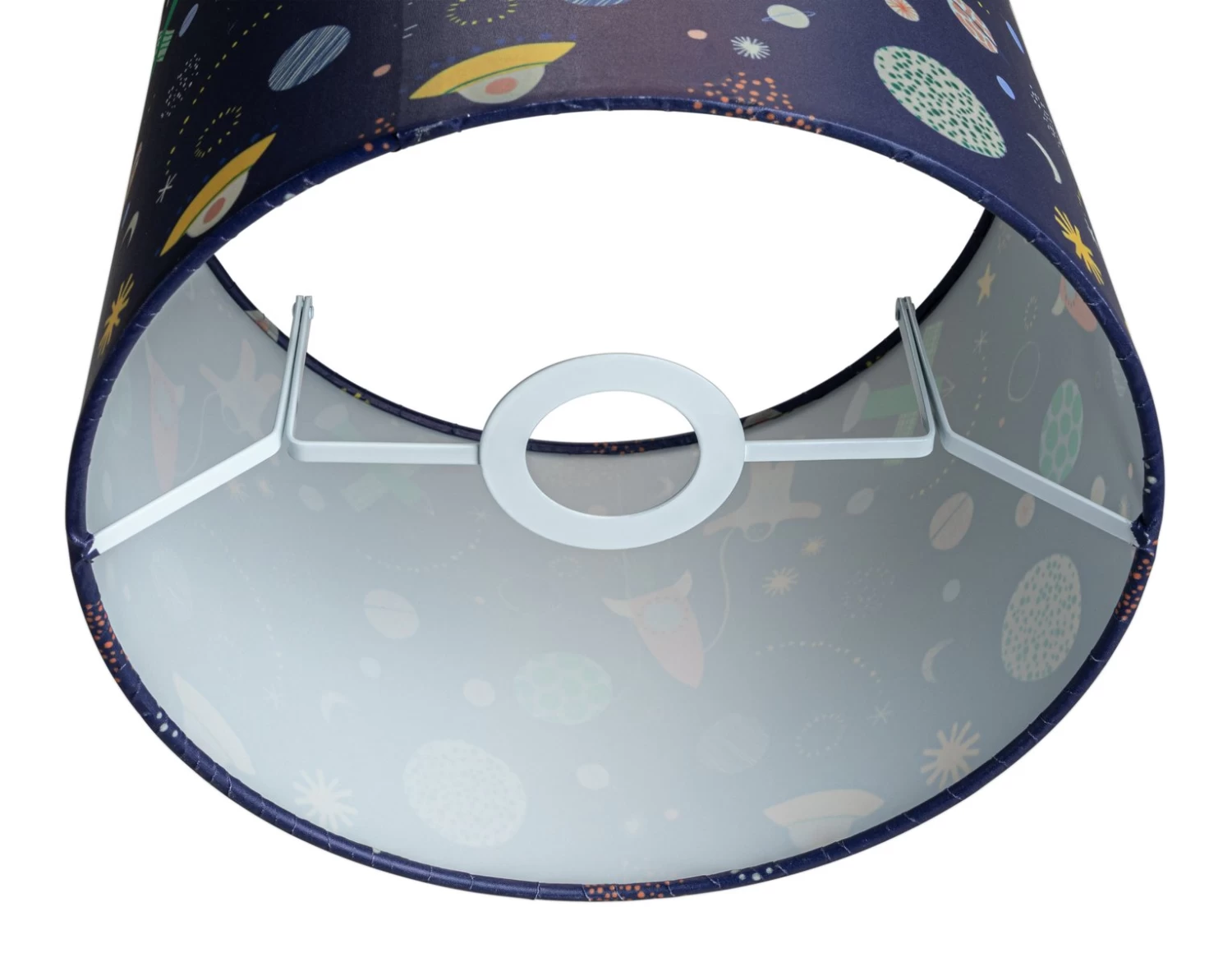 To the moon and back. With planets, rocket ships and more, this colourful galaxy print shade will send any child's imagination into outer space. And when the lights go out, it glows in the dark. Just the ticket for helping them blast off into dreamland. Cosmic.