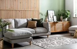 Plumptious perching. Some sofas are so relaxing they're very hard to leave. Like our Salome chaise left corner sofa. Upholstered in light grey herringbone fabric, the sumptuously sink-in seat and back cushions are softly inviting. And natural wooden legs to add to this 3-seater's contemporary good looks. Whether you're sitting or stretching out, this is one comfy corner chaise.