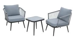 Cocktails or coffee? Take your pick and hunker down. Create a relaxing set up on your patio with this 2-seater bistro set. With a pair of comfy chairs and a matching glass top coffee table it's a great excuse for chilling out. Strong and smart. The frame is made from steel, and the grey rattan like rope is handwoven into a loose diamond weave. Comes with 4 cushions, all with removable, washable covers. Settle in and enjoy.