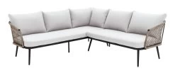 Corner the market in stylish garden furniture. Create a relaxing family size set up on your patio with this 5 seater corner sofa and matching glass top coffee table. Strong and smart. The natural frame is made from steel, and the rattan like rope is handwoven into a loose diamond weave. Comes with 8 comfy cushions, all with removable, washable covers. Gather round and enjoy.
