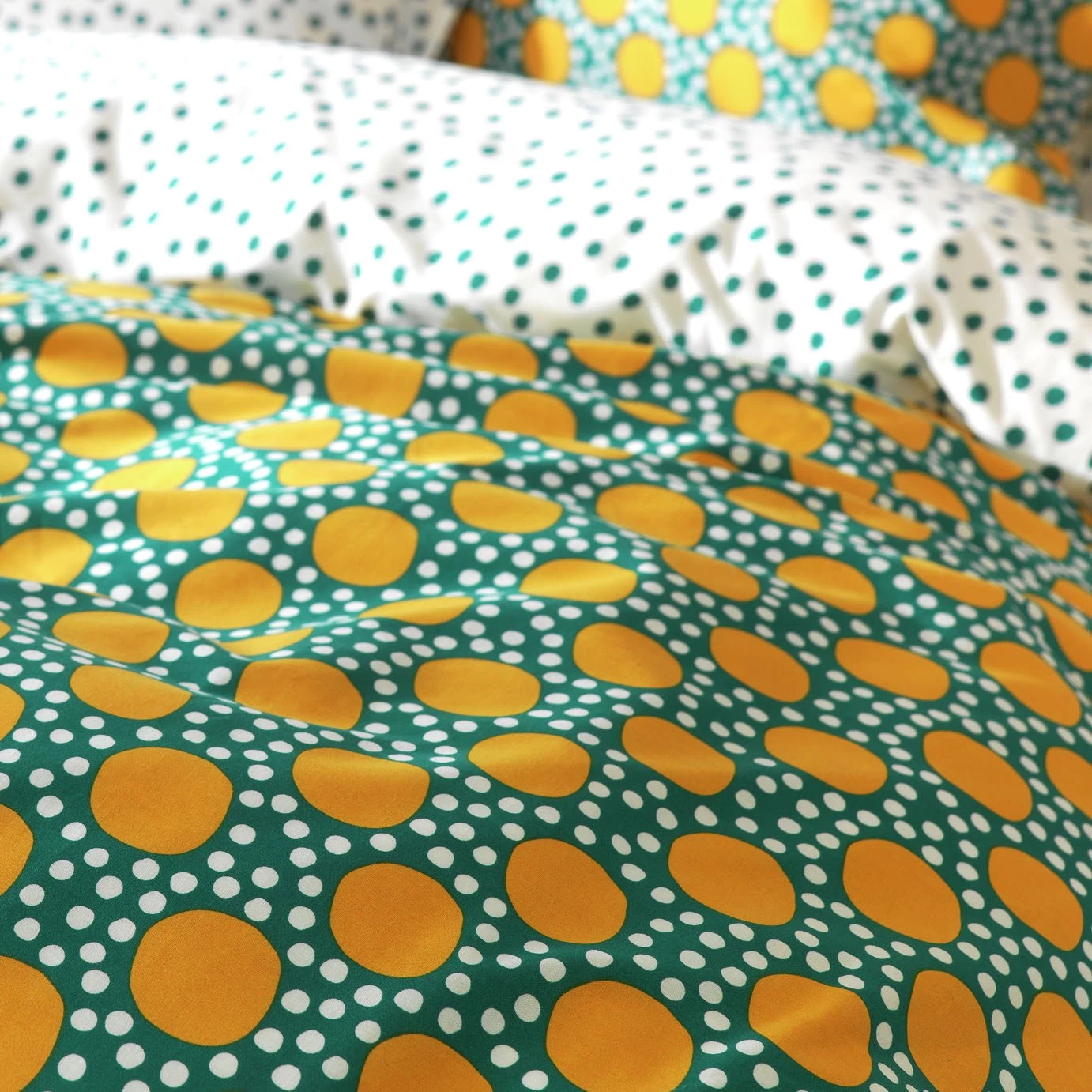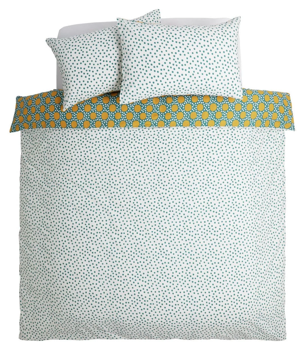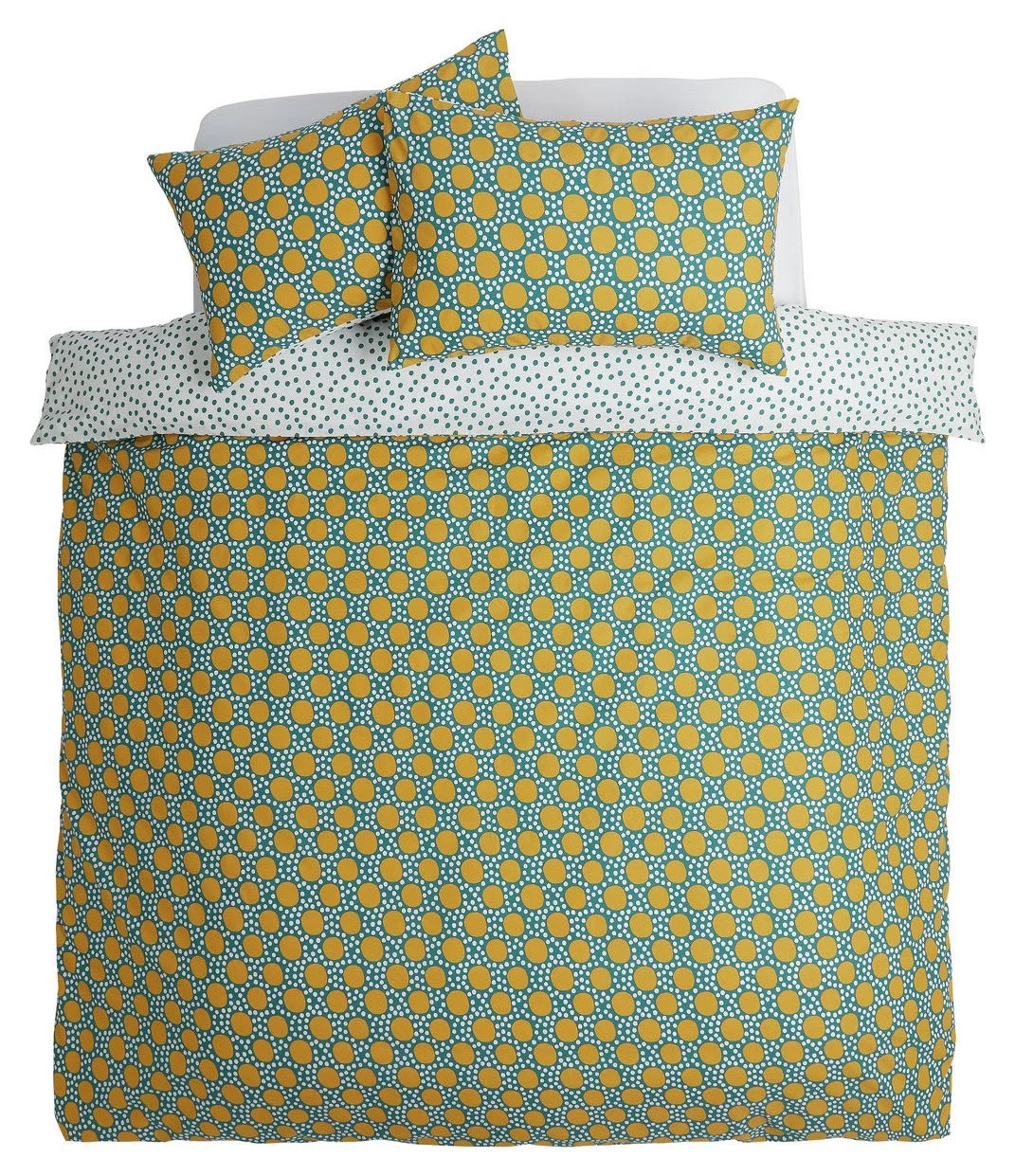 Good morning sunshine. Our Global Sunburst Geo bedding set features bold yellow graphics on one side and a spotted pattern on the other. Quite the showstopper. And made from a soft and airy polycotton blend, it's great for sinking into. Your daily dose of happy.