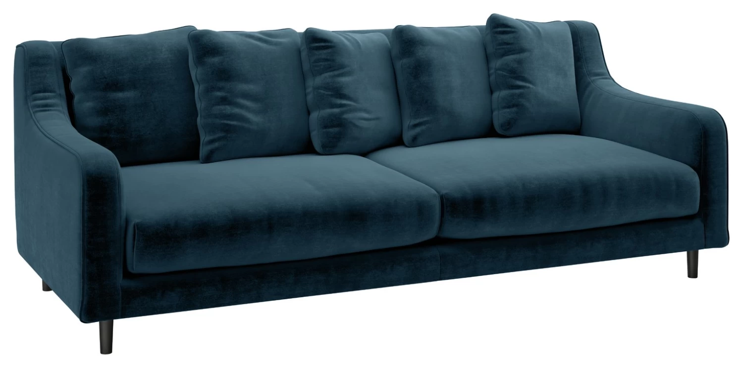 With elegant curved arms and deep seated cushions, the Swift 3-seater piave velvet ink blue sofa gives a nod to a mid-century design. Upholstered plump, feather-topped foam seat cushions and feather-filled scatter back cushions offer your body a high level of support as well as a sink into comfort feeling. A detailed Stitch runs across the curved arms that add to the design and gives the right amount of opulence. Perched on Dark oak legs, the grain of the wood compliments the sofa in luxurious ways.