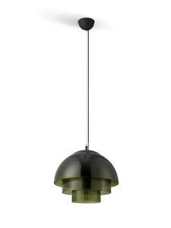 A shining style statements. Our large, 3-tiered tinted glass lampshade is opulent in olive green. Charmingly retro, this cool and curvy pendant light brings an extravagant feel to your lounge or bedroom. Each circular segment filters light beautifully, giving off a warm, cosy glow. We've included a black ceiling rose, cable and disc to tie it all together nicely. Ravishing, well-rounded and radiant.