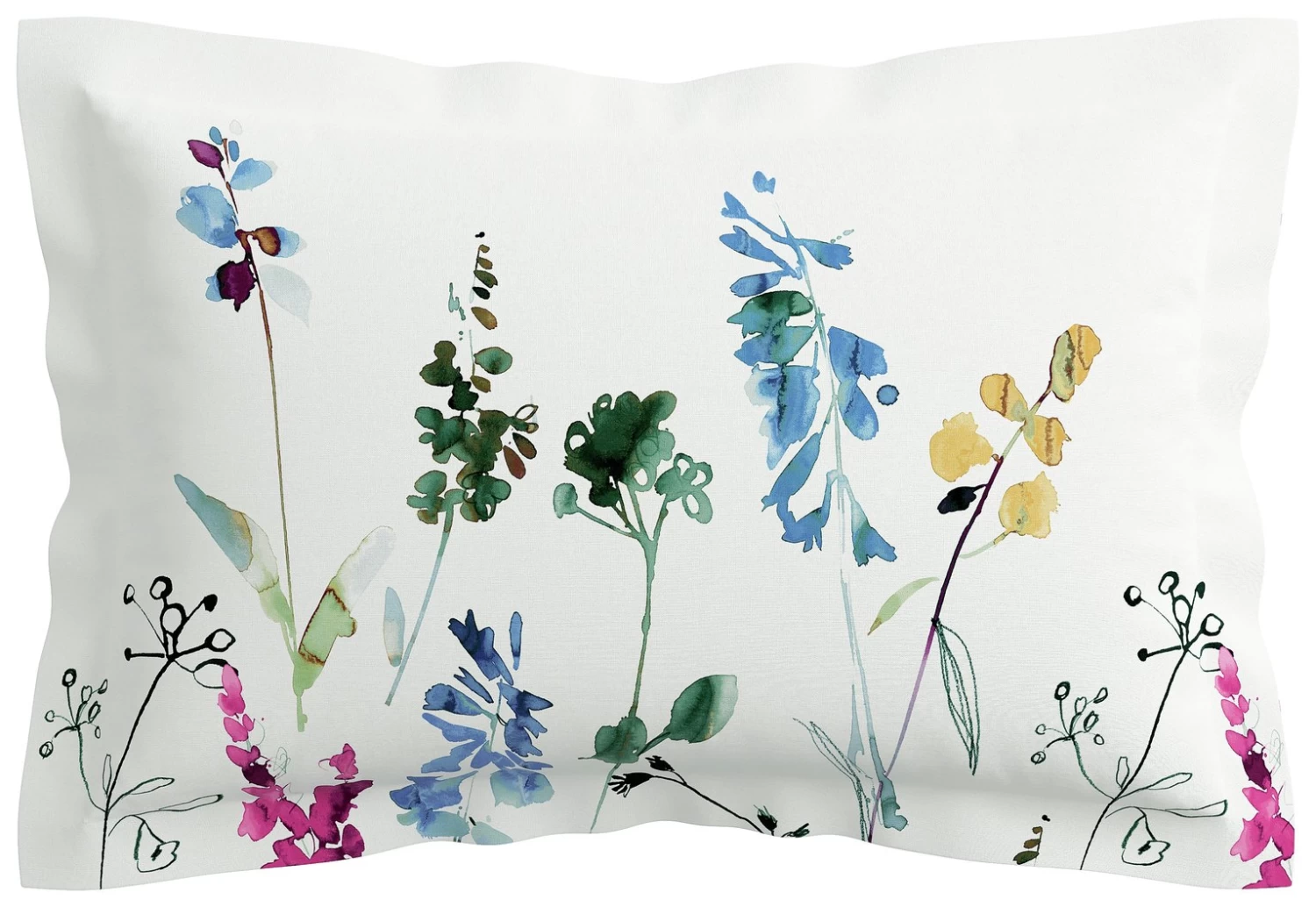 Rotary panel printed stem / floral design to front, hand painted spot design to reverse. Panel printed Oxford pillowcase with floral design starting from the bottom working up.