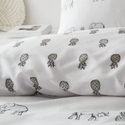Adorned with the brand emblem, these hand-drawn elephants and pineapples are set on a savanna of natural tones creating tranquillity. Alternative styling options with an all-over pineapple reverse.