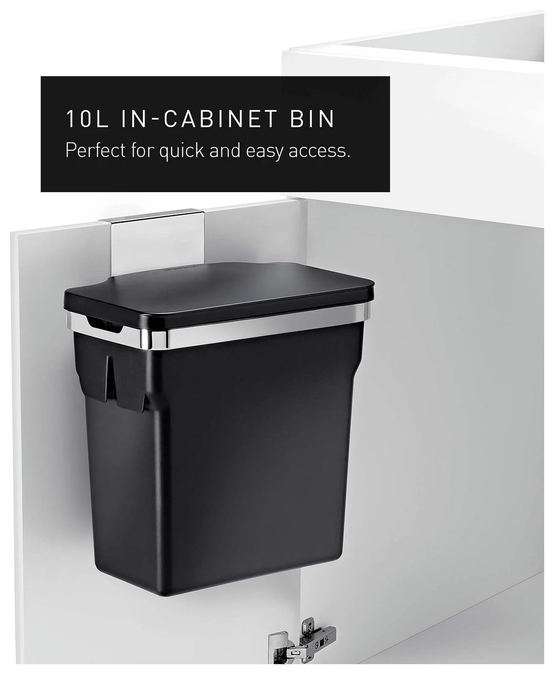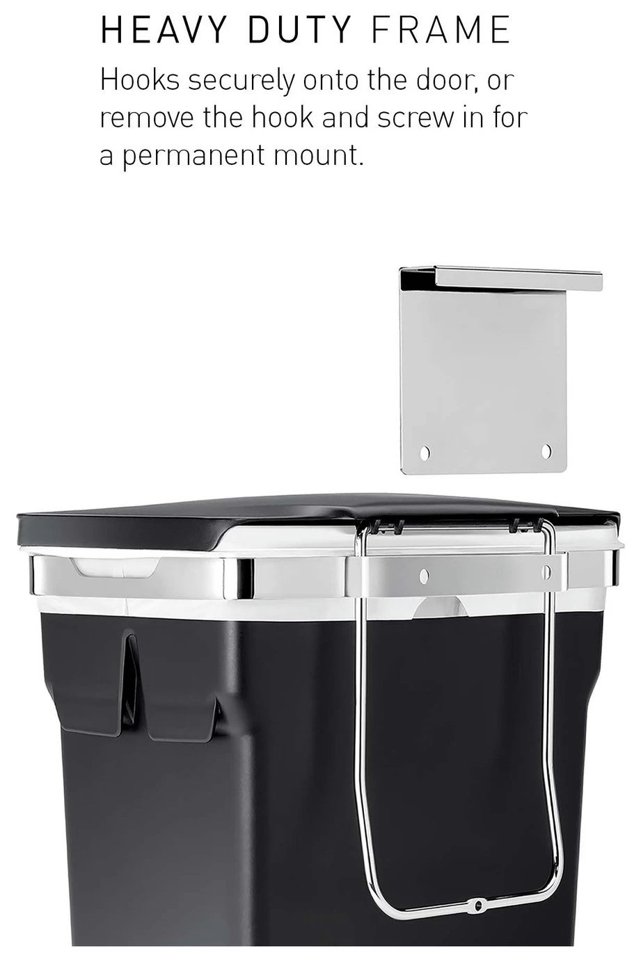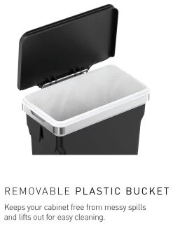 This in-cabinet bin hangs inside your kitchen cabinet door for quick and easy access while you are busy at the kitchen counter. The heavy-duty steel frame hooks securely onto the door or can be screwed in for a permanent mount. It also holds a durable plastic bucket that keeps your cabinet free from messy spills and lifts out for easy cleaning. Suitable for use in cabinets with a minimum depth of 23cm. When using the hanging bracket the top of the bin is 5cm below the top of the hanger. Watch out for pipes and other obstructions.