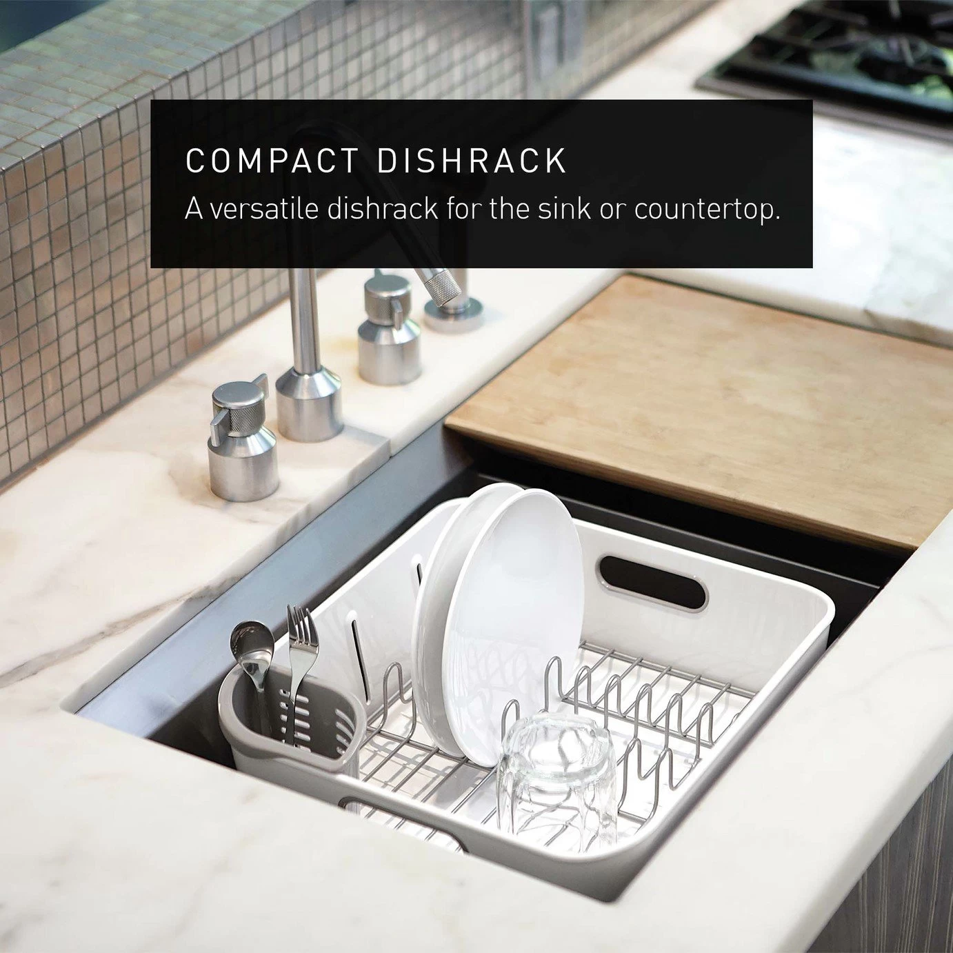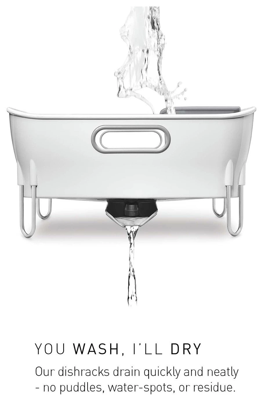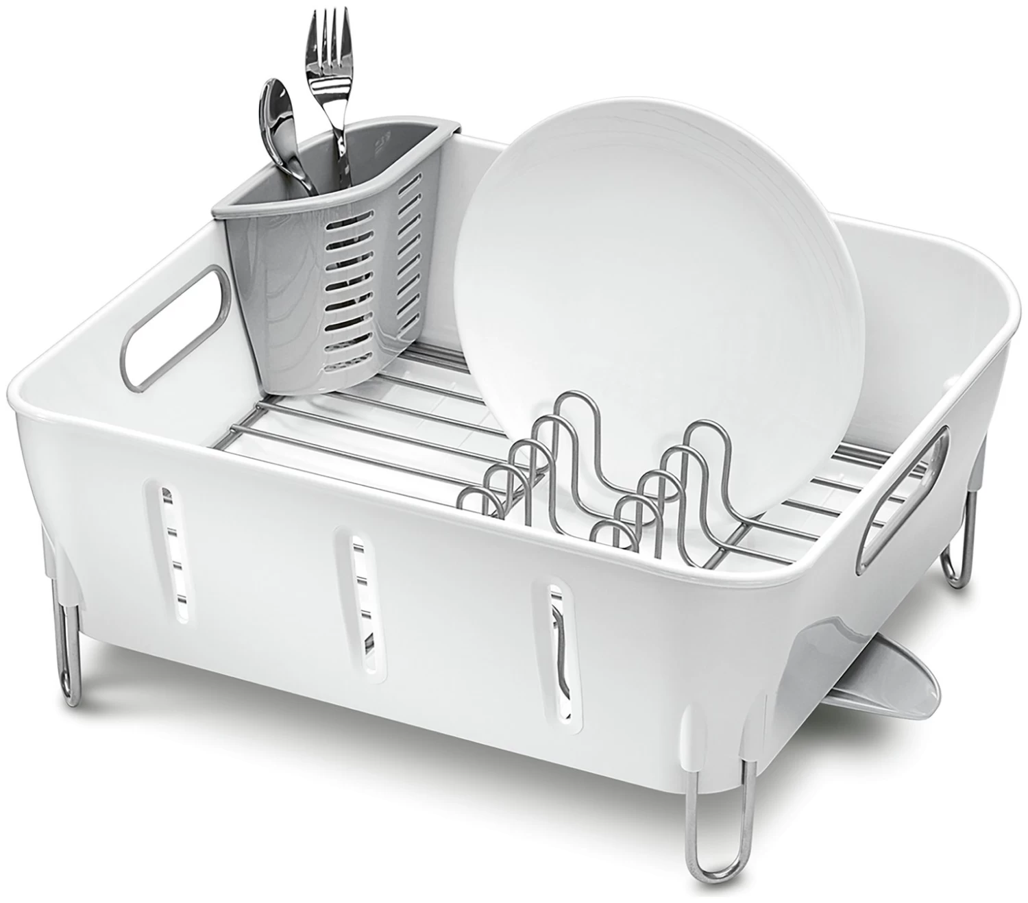This simplehuman white compact dish rack is ideal for smaller kitchens with limited space. Keep it on your worktop and the moveable spout will drain the water, or save time and space by placing it in the sink. It is rustproof, dishwasher safe, and includes a utensil holder to ensure your cutlery dries quickly and efficiently.