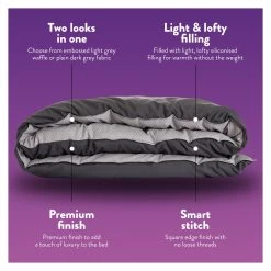 At Slumberdown, we believe everybody deserves a better night's sleep. The Slumberdown Coverless Comfort duvet and matching pillow cases have been designed to be stylish, comfortable and exceptionally convenient. The coverless comfort duvet is filled with our light and lofty fibres and has a reversible cover so you can choose from the beautiful white with grey stripe cover or the darker soft touch grey cover. This 10.5 tog duvet is perfect for all year round use. Packaging contains 30% recycled materials. Made in the UK.
