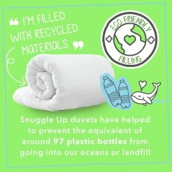 Cosy up and enjoy snoozy snuggles. The Snuggle Up duvet is made with soft covers and filled with oodles of squidgy fibres, keeping you super cosy all-night long, the perfect snuggle partner for chilly winter nights! The duvet is filled with recycled materials giving our lovely planet a helping hand. We care so you can be carefree, the squidgy fibres were once plastic bottles that have experienced a wonderful makeover. Our packaging is made from 30% recycled materials and can be fully recycled.
