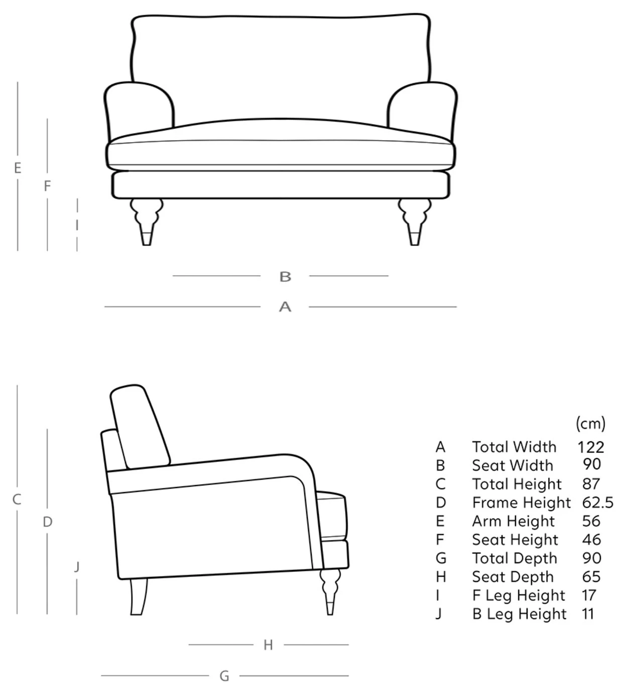- Width of seating area between arms: 90cm.